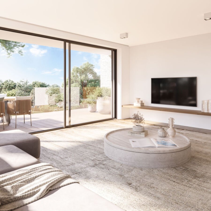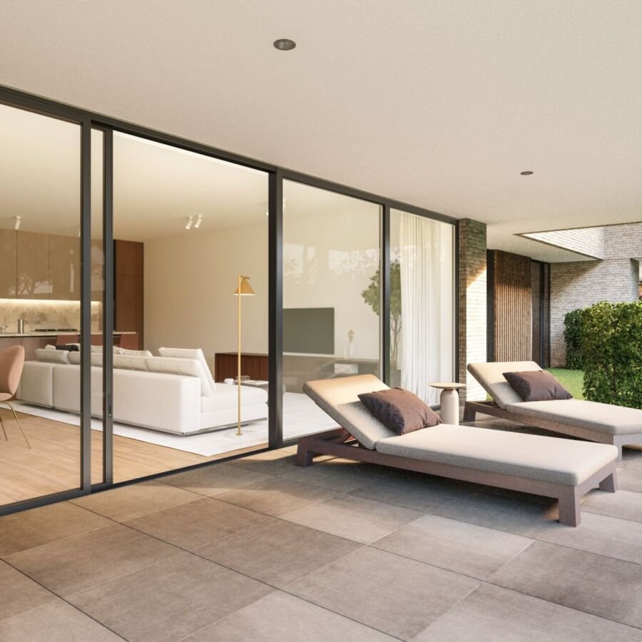 Elk appartement beschikt over een ruim terras dat uitkijkt op een rustgevend samenspel van een prachtig aangelegde tuin en natuurlijke groene zones.