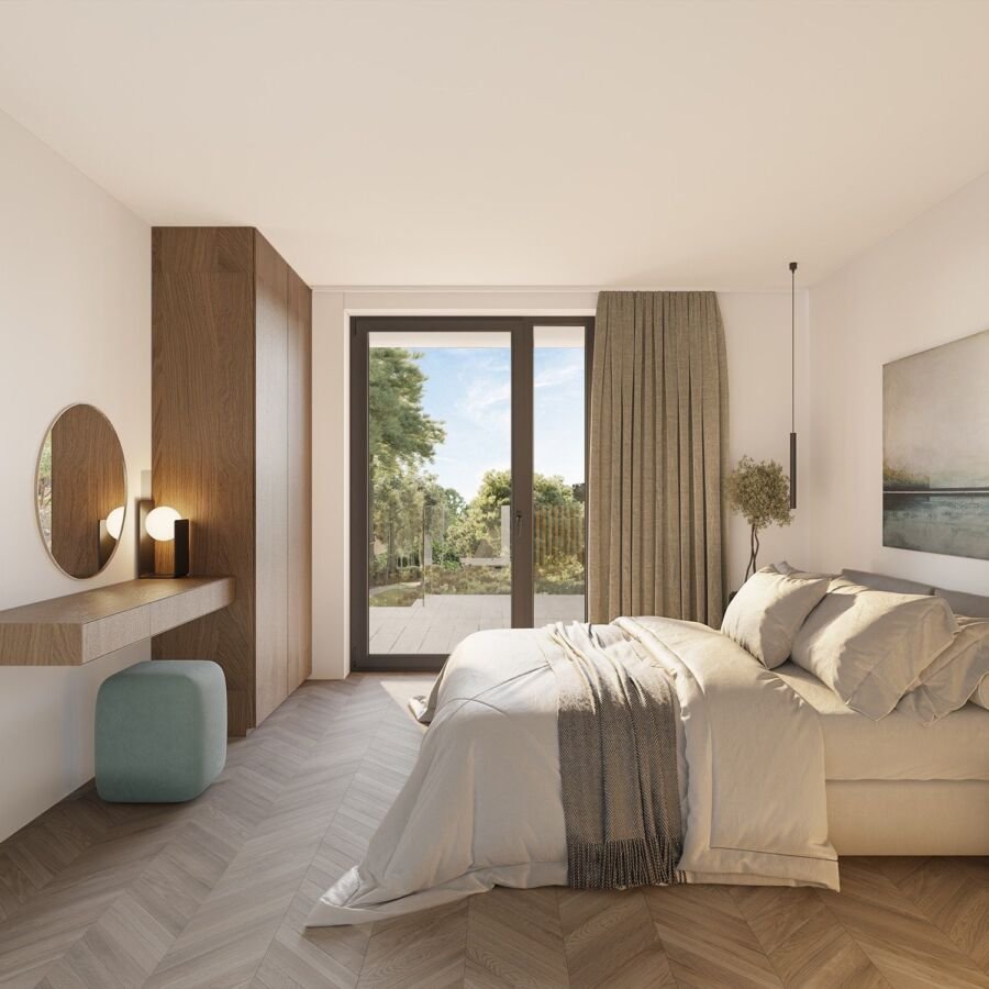 Elk appartement beschikt over twee ruime slaapkamers en een groot terras dat uitkijkt op het groen.