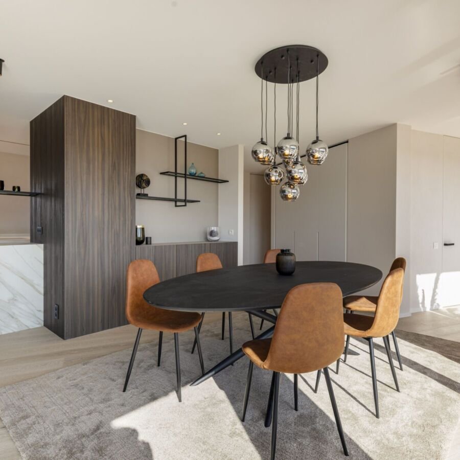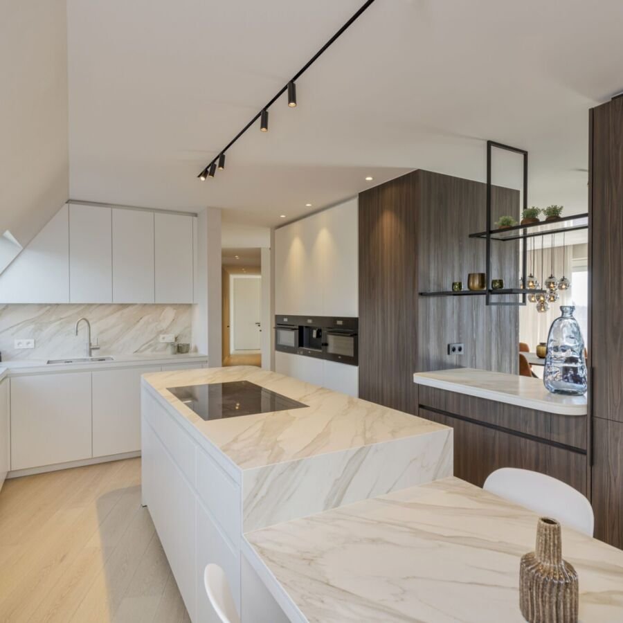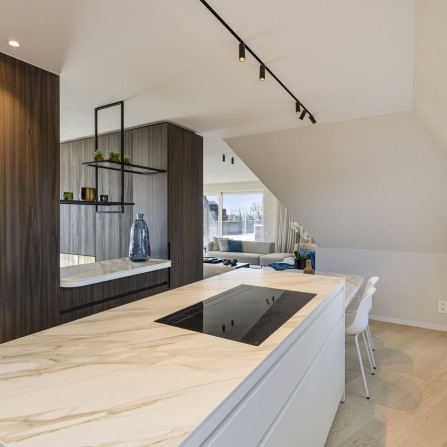 Centraal in de penthouse ligt een verfijnde open keuken met de nieuwste topapparatuur. Het royale kookeiland met geïntegreerde aanzittafel biedt een subtiele doorkijk naar de eettafel en een prachtig zicht op de leefruimte, waarbij contact en privacy harmonieus samenkomen.