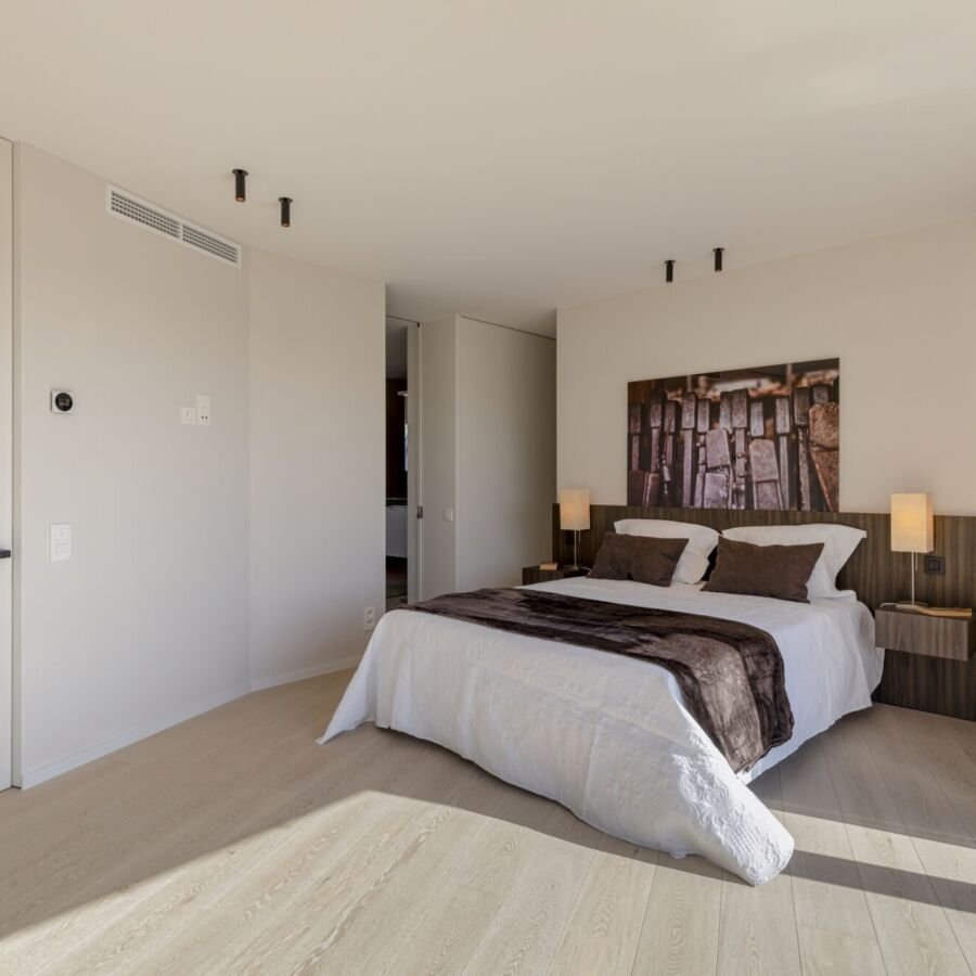 De nachthal verbindt een apart gastentoilet, een indrukwekkende master suite met dressing en wellnessbadkamer (ligbad, inloopdouche en terras), een tweede slaapkamer met privébadkamer en dressing, en een derde slaapkamer of bureau met eigen terras — ideaal voor werk, hobby of gasten.